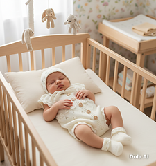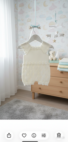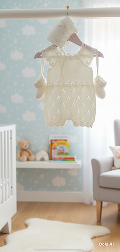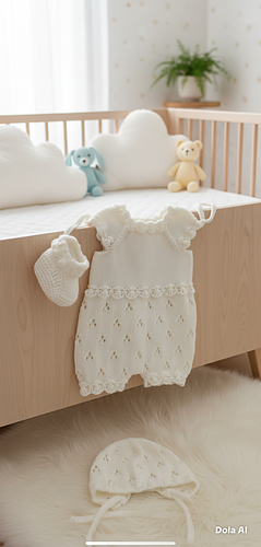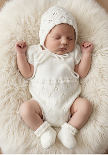 A pretty romper set with a matching bonnet and booties. Knitted on straight needles back and forth with line-by-line instructions. The romper is knitted from the top down, so minimal sewing is needed. It buttons up with 6 buttons on the back but can be worn with the buttons on the front. The bonnet is also knitted from the top-down. The little booties are quick to knit up and complete this beautiful little set