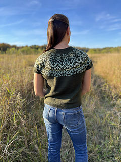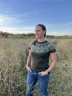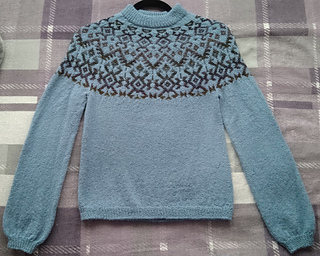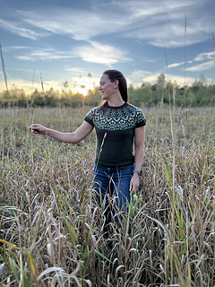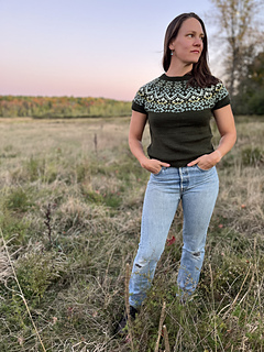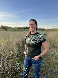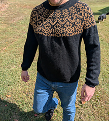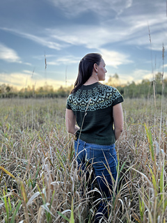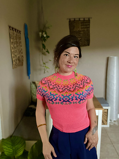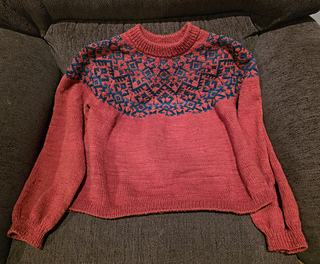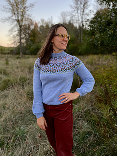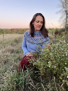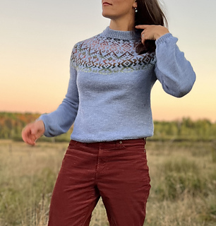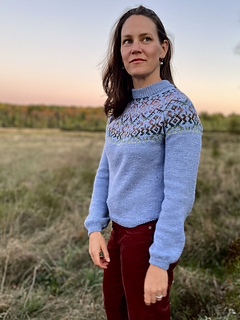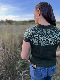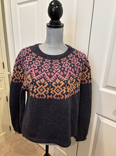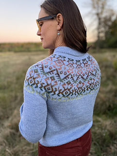 This round yoke sweater features a geometric pattern reminiscent of woven rugs and tapestries. The sweater is worked top-down starting with the collar, short rows which are worked flat, and colorwork for the yoke. The body and sleeves are separated and worked in stockinette, all finished with ribbing and a Tubular Bind-off. Options are given for long, slightly balloon shaped sleeves or short sleeves and two collar styles.