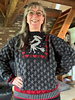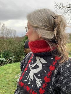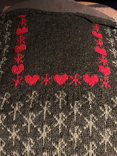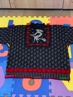 Choose from 2 sizes: S/M and L/XL. The photos show size S/M. You work in the round up to the armholes. Then you divide the work in two and continue knitting each part separately. The flying witch and the frame of red hearts and bind runes around the witch