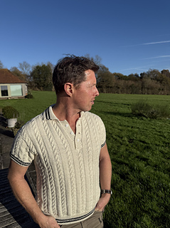 Perfect for warm weather and casual occasions, this is something of a cross between a cricket sweater and a polo shirt, featuring a classic cable pattern. A cotton yarn is recommended for that cool feel.