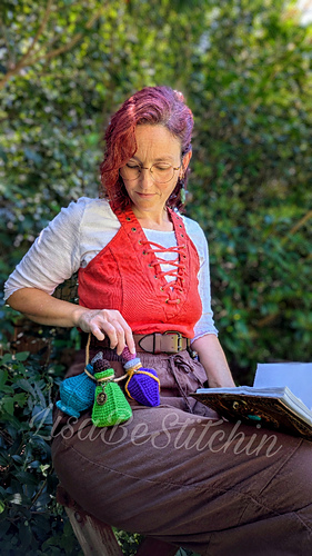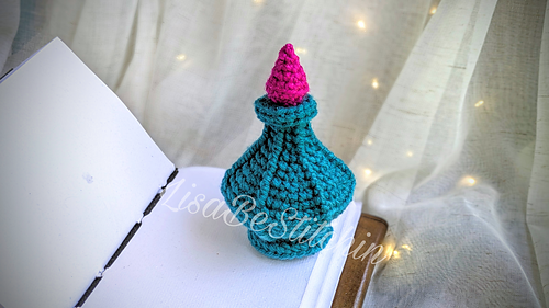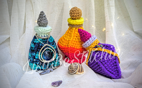 This bundle comes with three potion bottle options (Trapezoid, Hexagon, and Diamond) and two stopper options. This is the perfect starter kit for any budding magician! These bottles make great accessories for renaissance and fantasy faires, conventions, LARP events, or just decorating your apothecary shelf! When made larger they can also be used as trinket or dice bags. Bottles made with medium weight yarn measure about 6” tall (with stopper). Bulky = 7”. Super bulky = 8”.