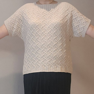 The Applepie Top is a bottom-up, short-sleeve top. The body is worked seamlessly up to the armholes, then divided for the front and back. After shaping the shoulders, the pieces are joined at the shoulders. The design features a combination of cross stitches and lace patterns that resemble apple pie, adding a 3-dimensional feel. It also offers a relaxed fit, providing a comfortable and natural look for daily wear.