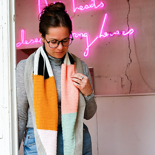 The Architect Scarf by A la Sascha is a unique crochet design that combines graphic sections with playful colors. Its elegant half-round shape drapes beautifully over the shoulders, making it both stylish and comfortable to wear. The pattern plays with stripes and colorblocking, giving each wrap its own distinctive character—perfect for crocheters who love a modern, eye-catching design.
