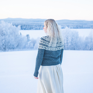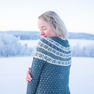 The Arctic Bloom Sweater is knit in one piece from the top down. After working the neckline ribbing, short rows are worked at the back of the neck to improve the fit. The colorwork pattern is worked while shaping the yoke with increases. The sleeves are then separated from the body and placed on hold on a stitch holder, and the body is continued down to the hem ribbing in an easy colorwork pattern before binding off. The sleeves are then worked in the same colorwork pattern as the body.