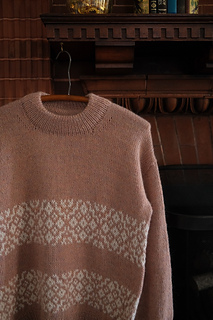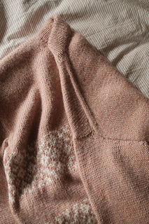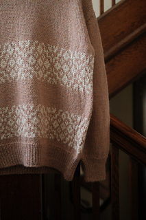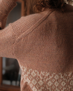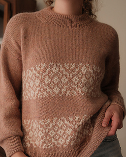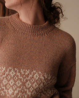 The Arden Pullover is worked top down and seamlessly in stockinette stitch and stranded colorwork. Circular needles are used to work flat at first, beginning with the upper back that increases to the width of the back, then is placed on hold. Stitches are picked up at each side of the piece to create the shoulders and front neckline shaping. The shoulders are joined and worked for a time to create the front, then joined in the round at the underarms to the back. The body is worked in the round to the desired length, finished with 1x1 ribbing, then bound off.