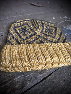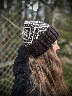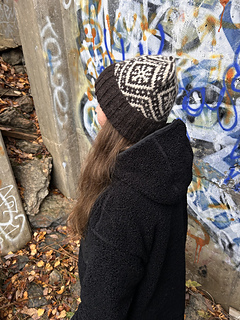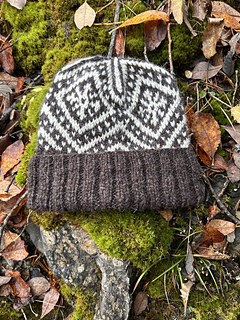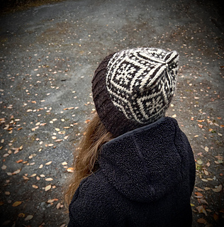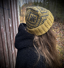 Årekristall Beanie is a beanie with a folded rib and a simple pattern inspired by a snow covered Åre in Jämtland. In the collection of Årekristall there are also mittens, a cowl, half-mittens and a sweater; all of which are available on Ravelry.