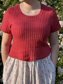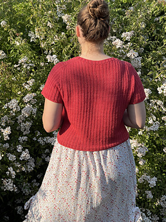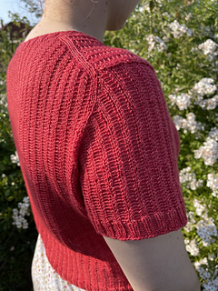 CONSTRUCTION: The Ariatee is knitted top down. First, the back is worked, followed by the front pieces. Then, stitches are picked up along the shoulders, and the yoke is joined in the round. Afterward, raglan increases are worked before dividing the body into sleeves and the torso. The sleeves are knitted first, followed by the neckline.