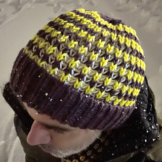 Simple but funky brioche-style hat inspired by the northern regions. It is knit flat from the bottom up, gathered at the crown, and seamed up the back. As a tuck based fabric it stretches a ton, so fits pretty much everyone!