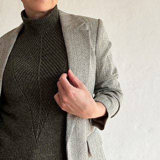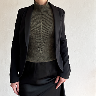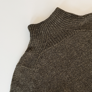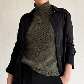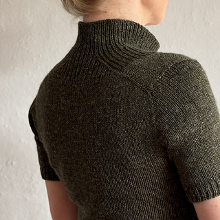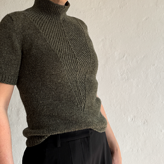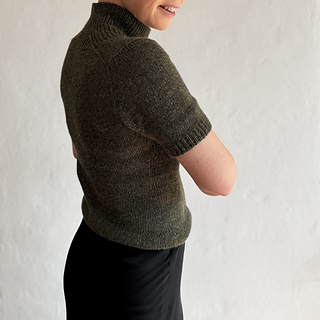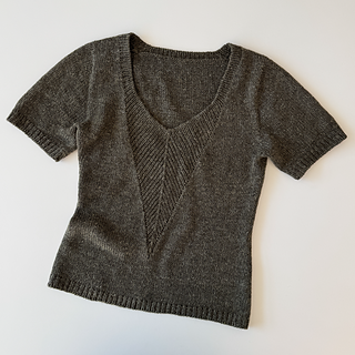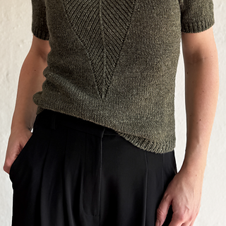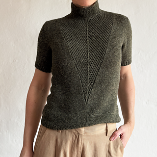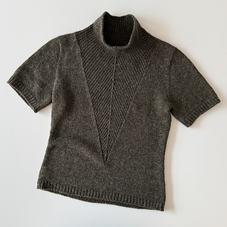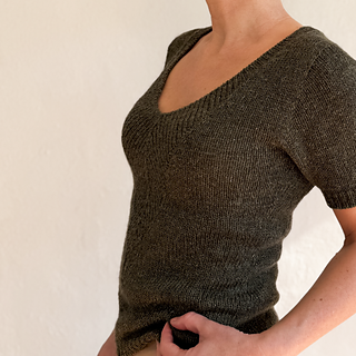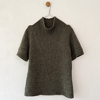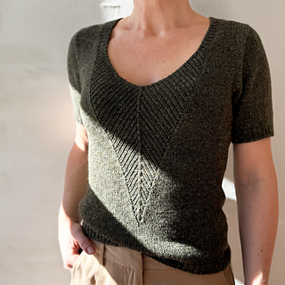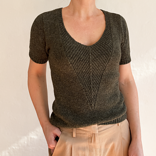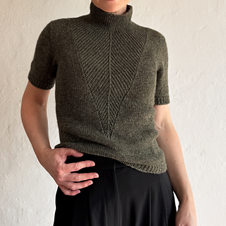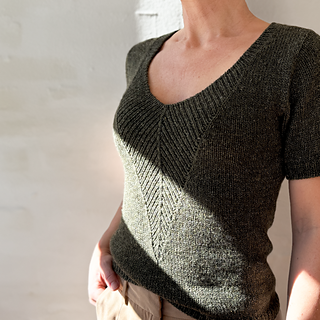 A t-shirt in stockinette stitch with a deep v-neck in rib with decreases. The neck can either be finished as a v-neck or continued into a high collar.