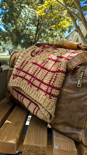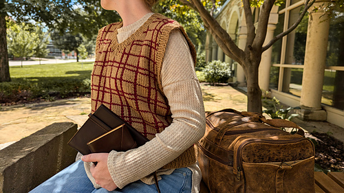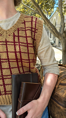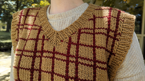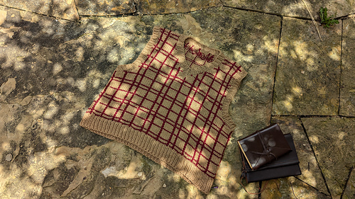 The Arthur Vest is inspired by the plaid vest worn by Mr. Weasley in the film Harry Potter and the Chamber of Secrets. It is a top down construction first knit flat, then in the round. It features a v-neck and a plaid print. First the back yoke is worked with increases for the bottom of the armholes. Then each front shoulder piece is picked up separately, with increases towards the center front to create the v-neck. Once the front shoulders are connected, stitches are increased along the bottom of each armhole. The front and back pieces are then connected with underarm stitches and the rest of the body is knit in the round. The horizontal stripes are knit with the garment, while vertical garter stitches outline where the vertical stripes will be placed. A crochet surface slip stitch technique is used to create the vertical lines. Stitches are picked up along the armholes and neckline and knit in the round to create the ribbing. It is knit using a Worsted weight yarn and 5.5mm needles to meet gauge.