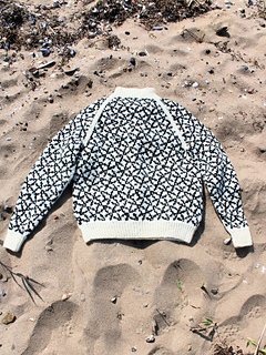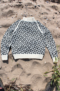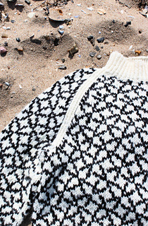 Arv (child) is a childs sweater. The sweater/pullover is worked from the bottom edge and up with a 2-color pattern. The sweater has a raglan yoke and sleeve construction and traditional rib edges. The pattern is made for at yarn with a gauge of 18 stitches per 10 centimeters (stockinette stitch) i.e. a yardage of approximate 90 meters per 50 grams.