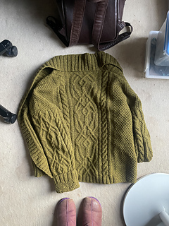 Pieces are knitted bottom-up in flat and then sewn together. The collar is knitted by picking up stitches at front panels and back neck edge, working in German Short Rows. Wet blocking is highly recommended.