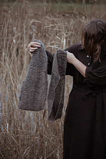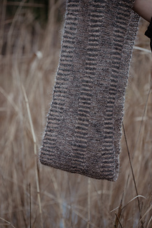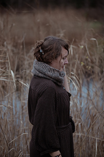 cast-on and assembled by grafting. It is patterned by two-row striped garter stitch (all knit sts) and reversed garter stitch (all purled sts). Light and stretchy to wear around the neck and also allows both single-ply wool and unspun wool to shine. The cowl is designed to be worn wrapped twice around the neck. Adjust the length to fit your needs, just keep in mind that the garter stitch makes the fabric very stretchy.