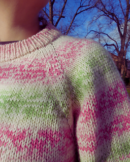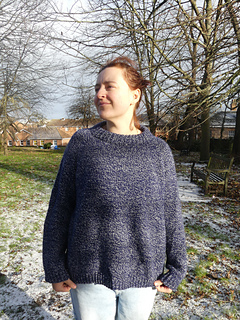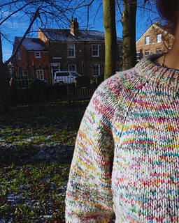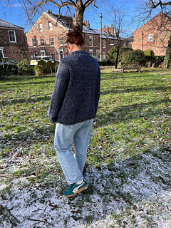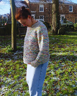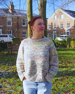 The Askrigg sweater is a top-down raglan sweater and can be knitted by holding a DK and fingering weight yarn together or with an aran weight yarn. First, you’ll knit the (optional) double folded collar and then knit short rows to improve sweater fit. Raglan increases are worked every other round with some sizes using compound increases in later rounds. The body and arms are then split, and the sleeve stitches put on hold whilst the body is knit. The sleeve stitches are then picked back up and knitted. As this is a top-down pattern, it is easily adjustable for length and whilst the samples use a deep rib, this is also optional. Sizing is based off the Knitting Council size guides.