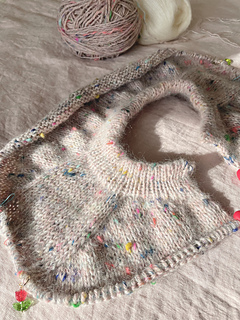Main colour : La Bien Aimée-Corrie Confetti (100 g / 230 m), Aimée’s peach sweater & white mohair held together