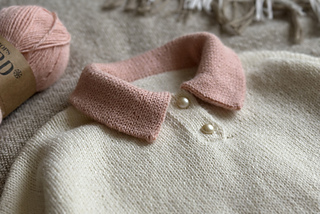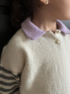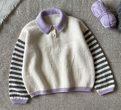 Aster Sweater is knitted top down, starting with the back yoke which is worked back and forth (while shaping shoulders and back neck with short rows), after that sts are picked up across the shoulders to form the front yoke, then the rest of the body is worked in the round till it’s finished. Sts for the sleeves are then picked up and worked in stripes pattern in the round, and finally sts for the double knitted collar are picked up, and knitted in the round.