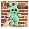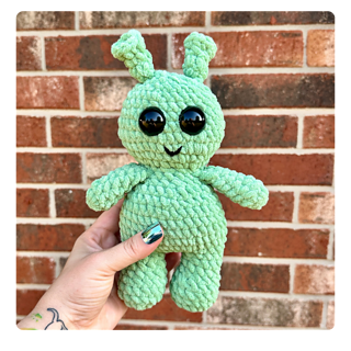 This pattern makes an alien plushie that is approximately 10-11” tall if using a weight 5 (super bulky) yarn. It is a low-sew pattern because only the antenna needs to be sewn on. The body and head are crocheted as one continuous piece, and the arms are crocheted directly into the body.
