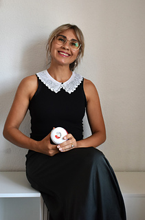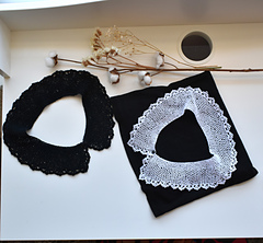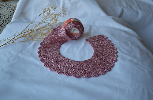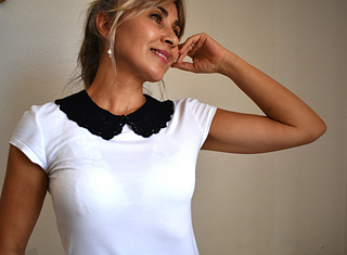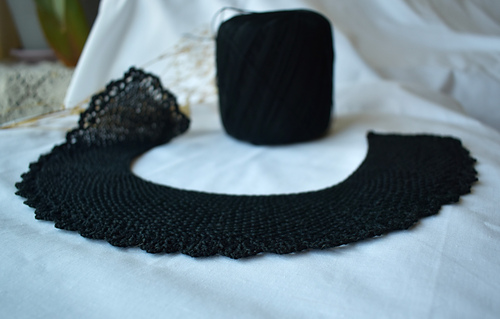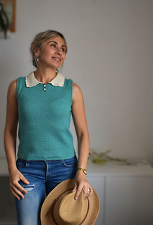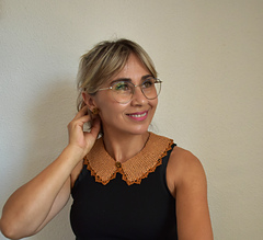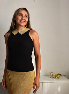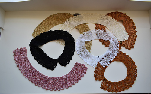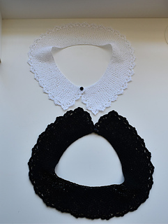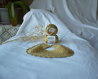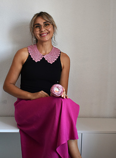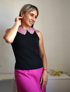 This is a classic style, knitted collar accessory, with a crochet decorative trim. It has few different options of fastening at the front and it can be made following this pattern with 5 different types of yarn. The pattern includes size and gauge chart for 5 different types of yarn, which are: Katia Brisa, Anchor Metallic Fine, Anchor Freccia 20, Anchor Freccia 12 and Katia Alexandria. But the collar pattern has been created and tested with Concept Katia Silky lace, during the test of Audrey Sleeveless blouse, which is lace weight yarn.
