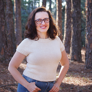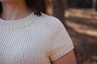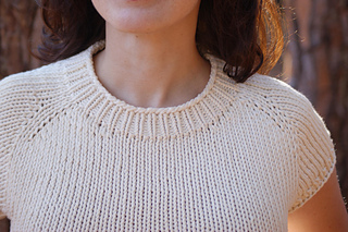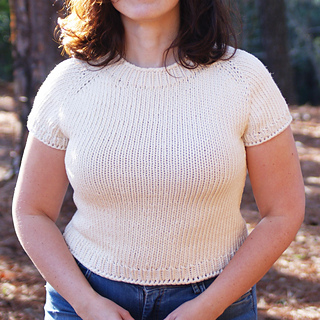 Chunky knitted T-shirt, worked from the top down, seamless, and with compound raglan sleeves. The compound raglan mimics some of the sleeve cap shaping found in a set-in sleeve construction, which contributes to a comfortable fit. With the exception of a few short rows after the neck ribbing, the entire tee is worked in the round.