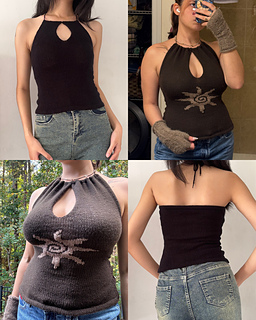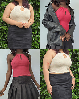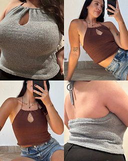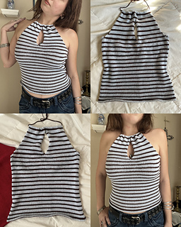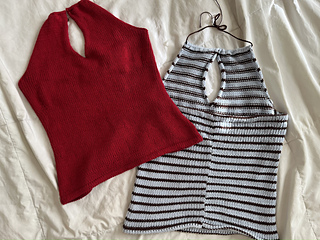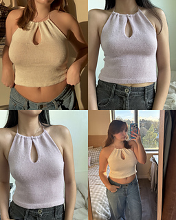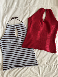 August top is a knit halter top with a high neck line and eyelet detailing. The August Top pattern is written in English, uses US Knitting Terminology, and is suitable for advanced beginners. The pattern is made to personal measurements; it can be recreated to fit any measurement.