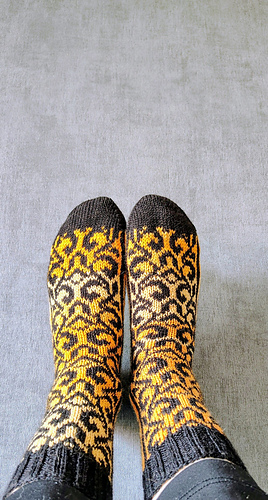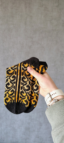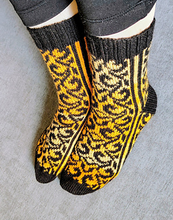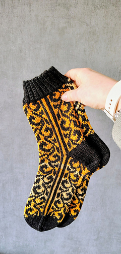 These socks are like a little piece of art on your needles. The flowing, intricate pattern winds across the fabric in a rich contrast of deep black with warm shades of ochre and gold. As you knit, each stitch feels satisfying and steady, the kind of rhythm you can really sink into while watching the design slowly come to life.