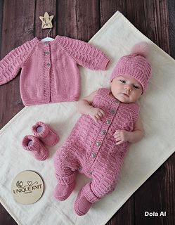 A knitting pattern for a 4 piece Dungaree set with a simple textured stitch.