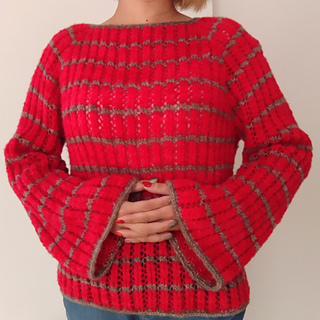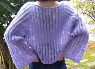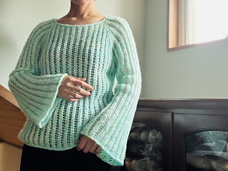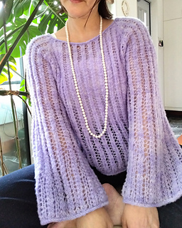 The pullover is worked seamlessly from the top down in the round. Begin at the neckline, work raglan increases while knitting the lace pattern, then separate sleeves and body at the underarm. The body is worked straight with no shaping and finished with an i-cord BO. Sleeves are worked in the round without shaping to below the elbow, then gradually increased to form flared cuffs, finished with an i-cord BO.