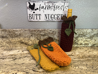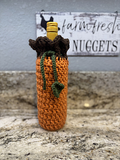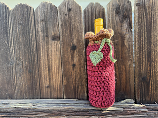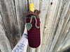 The bottle cozy is made holding two strands of yarn together. You will need small amounts of yarn. Great for using up scrap yarn.