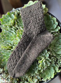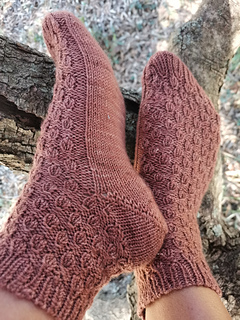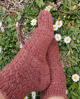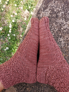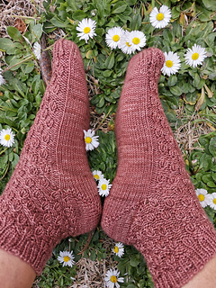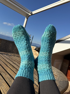 These socks are worked cuff down. The heel is shaped with German short rows. Simple ribbing-like pattern is created by using increases and decreases.