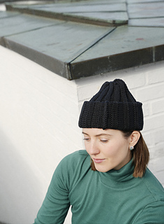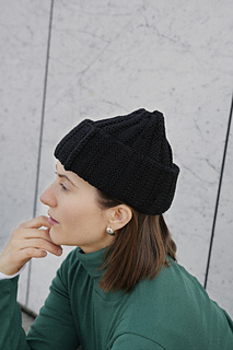 Axis Beanie is worked sideways in stripes of stockinette stitch, alternating between right side and wrong side. The beanie is worked flat and seamed along the side at the end.
