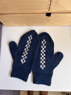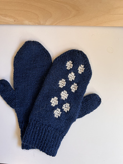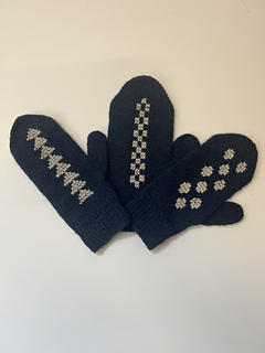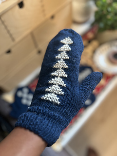 The Axis Mittens are worked in Stockinette stitch, with delicate geometric cross stitch motifs embroidered on top in a contrasting yarn.