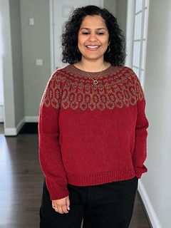 Azuni is knitted seamlessly from the top down. For a comfortable fit, series of short rows and raglan increases are worked before and after the yoke. The sleeve stitches are put on hold in order to knit the bottom of the sweater. Then the sleeves are knitted in the round. The collar stitches are picked up and knitted at the end to add structure and durability to the sweater.
