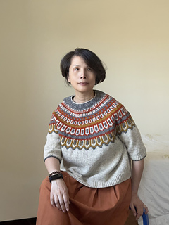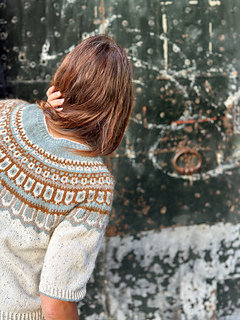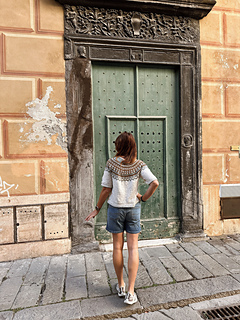 This pattern is made in 4 colors with the stranded knitting technique (3 colors per row), in the yoke a single chart containing the increases is followed. The geometric motifs decorating the yoke gradually increase in size. The result is a harmonious and balanced design.