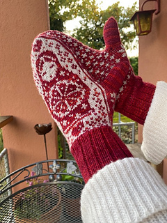 For one shorter hand pair of mittens, I used approx. 1.1 oz (30 g) in MC, 0.7 oz (20 g) in CC and 0.35 oz (10 g) für the cuffs.