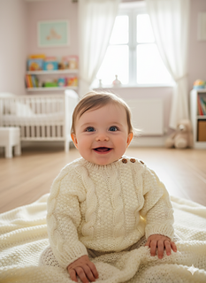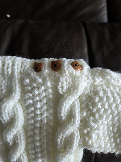 A quick and easy cable pattern with a traditional Aran feel to it. This is knitted in Aran yarn and has the feature of 3 buttons on the shoulder for the ease in dressing.