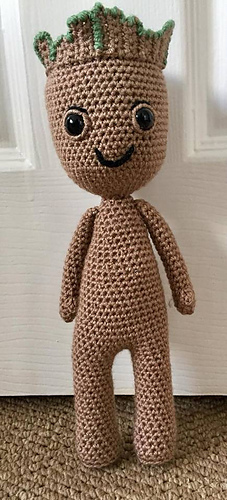 Baby Groot will stand at approx 12 inches tall, though this will depend upon the size of the hook and thickness of yarn you use