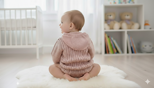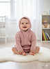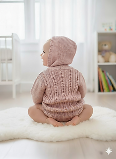 A modern take on design with a hoodie but with a simple 2 row lacy pattern on the main body to make it delicate for a baby.
