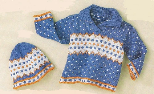 This adorable toddler’s pullover and hat are worked in three colors with a dot pattern.