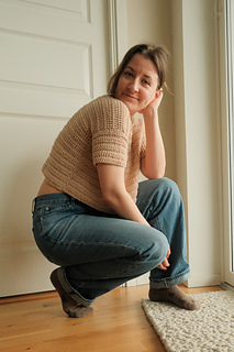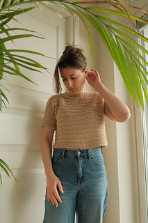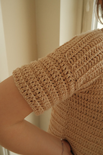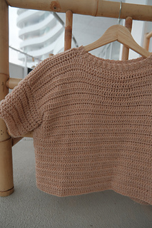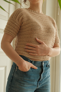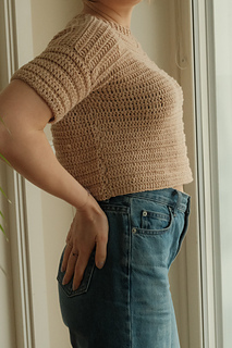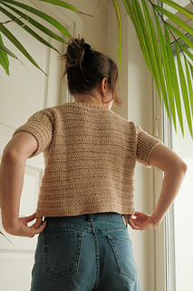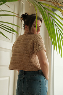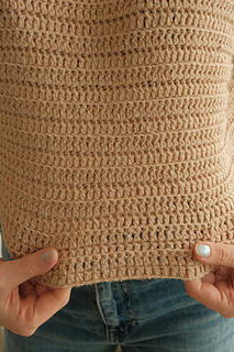 The tee is worked flat in double crochet through the back loop only. This gives it a beautiful ribbed texture that looks way more complicated than it is. Everything gets sewn together and finished with a neat ribbed neckline.