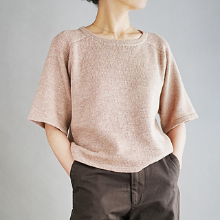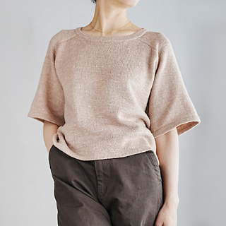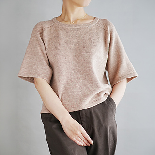 編み方は、まず肩と背中のパーツを編み、そこから前後身頃の目をそれぞれ拾い、脇下でつなげて裾まで輪で編み進めます。袖と衿は、拾い目をして輪で編み、裾と同じように折り返して仕上げます。