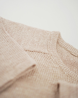 Both samples are Size 2, knitted with De Rerum Natura “Alice” (75% Merino, 25% Linen; 50 g = approx. 216 m / 236 yds). The short ver. used 4 skeins in color “Porcelaine,” and the standard ver. used 5 skeins in color “Café Crème.”