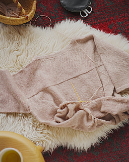 It begins with the shoulders and back worked sideways. Stitches are then picked up for the front and back, joined at the underarms, and worked in the round down to the hem. The sleeves and collar are also picked up from the body, worked in the round, and finished with a folded edge to match the hem.