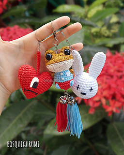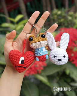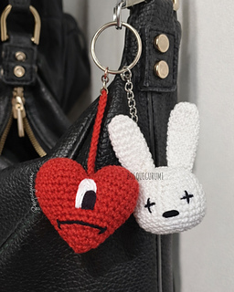 These are fan-made Bad Bunny crochet keychain PDF patterns. The file includes three patterns: Bad Bunny, UVST Heart, and Sapo Concho inspired amigurumi keychains.