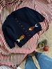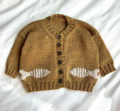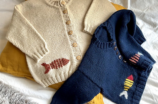 The front panels are joined to the back, and the body is knit flat. The sleeves will then be picked up and knit top down in the round. The button-band is added next by picking up stitches on each front panel, followed by the collar. Decorative fish are added last using the duplicate stitch technique.