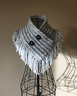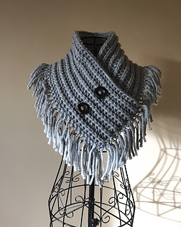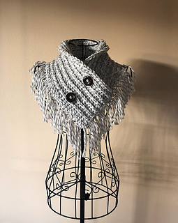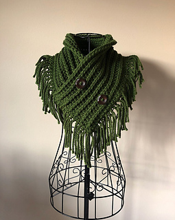 This pattern is for my Bailey Fringed Scarf, this is a infinity triangle scarf. It is worked in a rectangle, then joined together. The buttons are decorative as it doesn’t come apart.