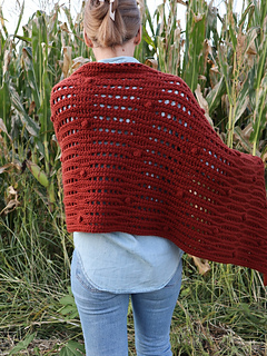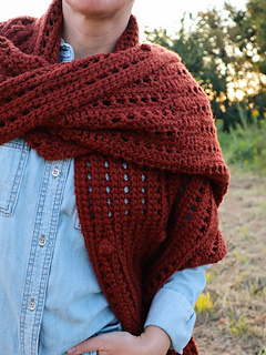 This oversized crochet shawl features a unique combination of undulating ribbing, bobbles, and open lacework — creating a versatile sophisticated and modern piece that can be worn as a shawl, wrap, or scarf.