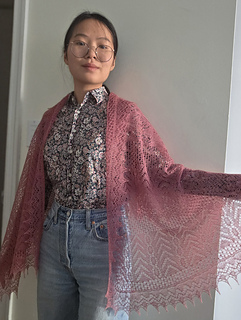A rectangular shawl with motives from the Shetland lace tradition. The center is knit first with provisional cast on, continuing with the first border. The second border is knit onto the provisional cast on (no grafting!). A narrow frame is knit in the round, and finally an edging is knit onto the frame. Customizable in length, and suitable for different weights of yarn. The pictured sample was knit with a laceweight yarn, 1100m / 100g.