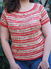 Barcelona Tee is knitted from the top down, seamless in the round. The neckband is shaped with short rows to raise the back of the neck. Sleeve stitches are set aside, underarm stitches are cast on and the body is completed. Sleeve stitches are then picked up and the ribbing is knitted down.