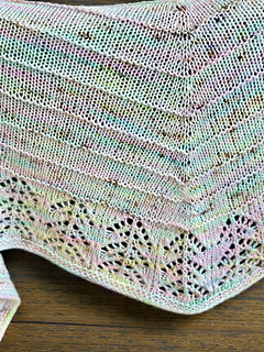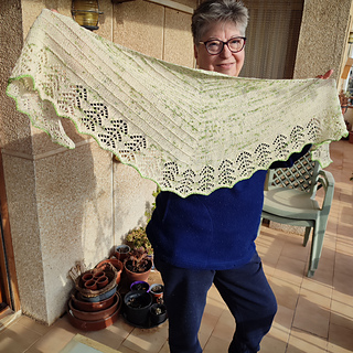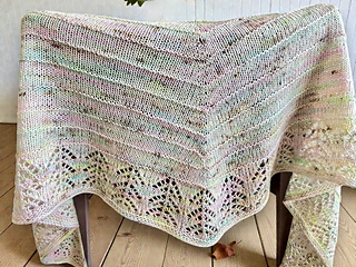 The ‘ripples’ of the garter stitch and the lovely lace pattern lead to a pleasant knitting experience and make this shawl quite an entertaining project.