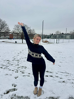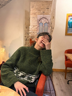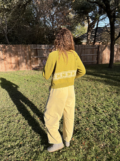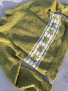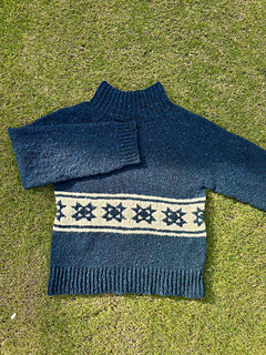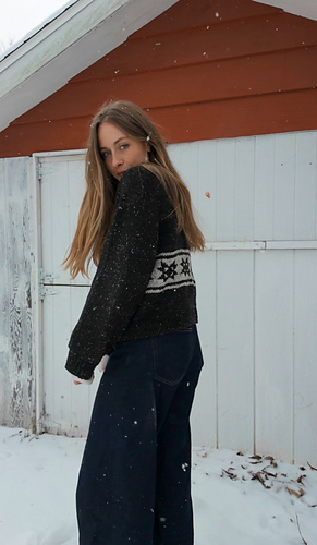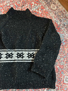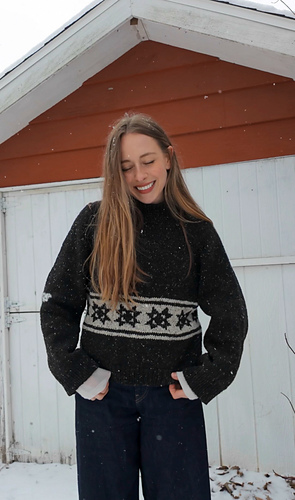 oversized sweater with a quilt star motif. It is knit in the round beginning with a tall mock neckline then the shoulders are shaped with German short rows. The rest of the sweater is shaped with raglan increases, then split for the body and arms. The quilt star motif is made using stranded colorwork in the round.